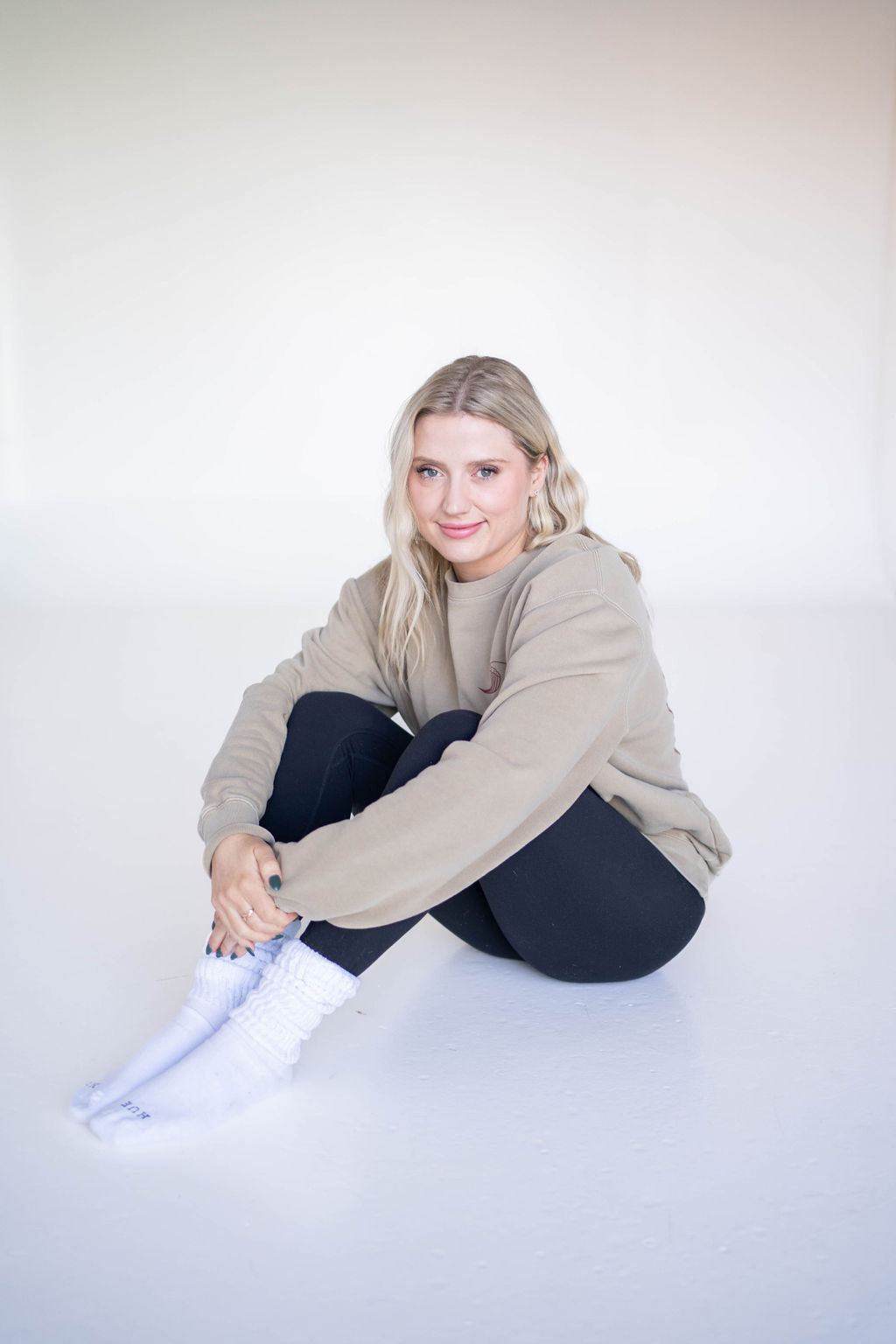 •Sand is in the original crewneck style we all know and love! It hangs a little straighter than Marine Blue/Sea Green sweatshirts, with a relaxed cuff and waistband. Annalee is a true medium, size 6, and prefers a Large in Guppy/Midnight/Sand for a baggy look.